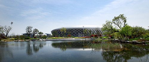 據(jù)夏修智介紹,奧體公園是工程的主要景觀節(jié)點,位于奧體中心西北側(cè),面積約5萬平方米,是一座集娛樂、運動為一體的特色濱水運動公園,也是整個奧體中心的“綠肺”。一條蜿蜒的河流將公園劃分為東部運動區(qū)和西部休閑公園區(qū)。運動區(qū)緊挨訓(xùn)練中心,東側(cè)便是足球場、籃球場和排球場,運動后就能感受到融入大自然的清新;休閑公園區(qū)包括入口廣場、樹陣廣場、以及河水匯聚而成的小人工湖,湖邊蘆葦迎風(fēng)擺動,湖水清澈見底,鵝卵石鋪就的湖底清晰可見。整個奧體公園以中國古典園林為主、回歸自然的組團(tuán)式造景手法,強(qiáng)調(diào)休閑、幽靜、生態(tài)自然。從西入口廣場的草坡,逐漸過渡到觀賞性強(qiáng)的觀花、觀葉園林樹種,配合灌木、草木、地被形成人為景觀,從西到東植物次第減少,層次不斷變化,形成了從自然生態(tài)狀綠化到人工幾何狀綠化的逐漸過渡,讓自然的活力與體育精神融為一體。