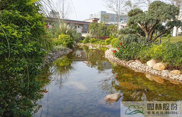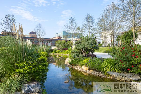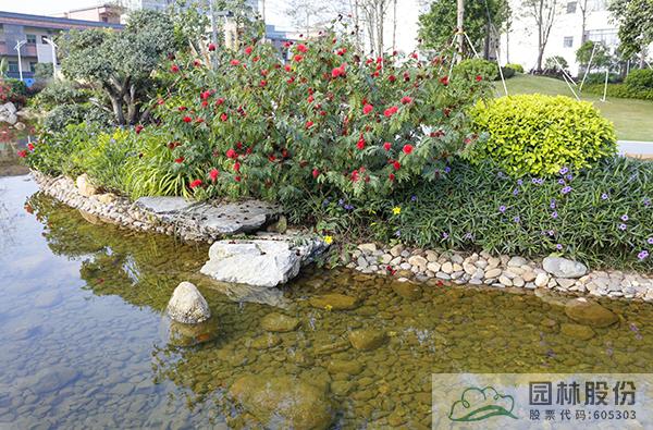 融入海綿城市理念打造的旱溪景觀,用鵝卵石鋪裝,點綴景石,岸邊種植造型水蠟、楊梅、蘆葦、蒲草、三角梅、黃金葉、黃金榕、朱蕉、扶桑花、變葉木、紅千層等當地鄉土植物,打造生態環保的地域特色景觀風貌。