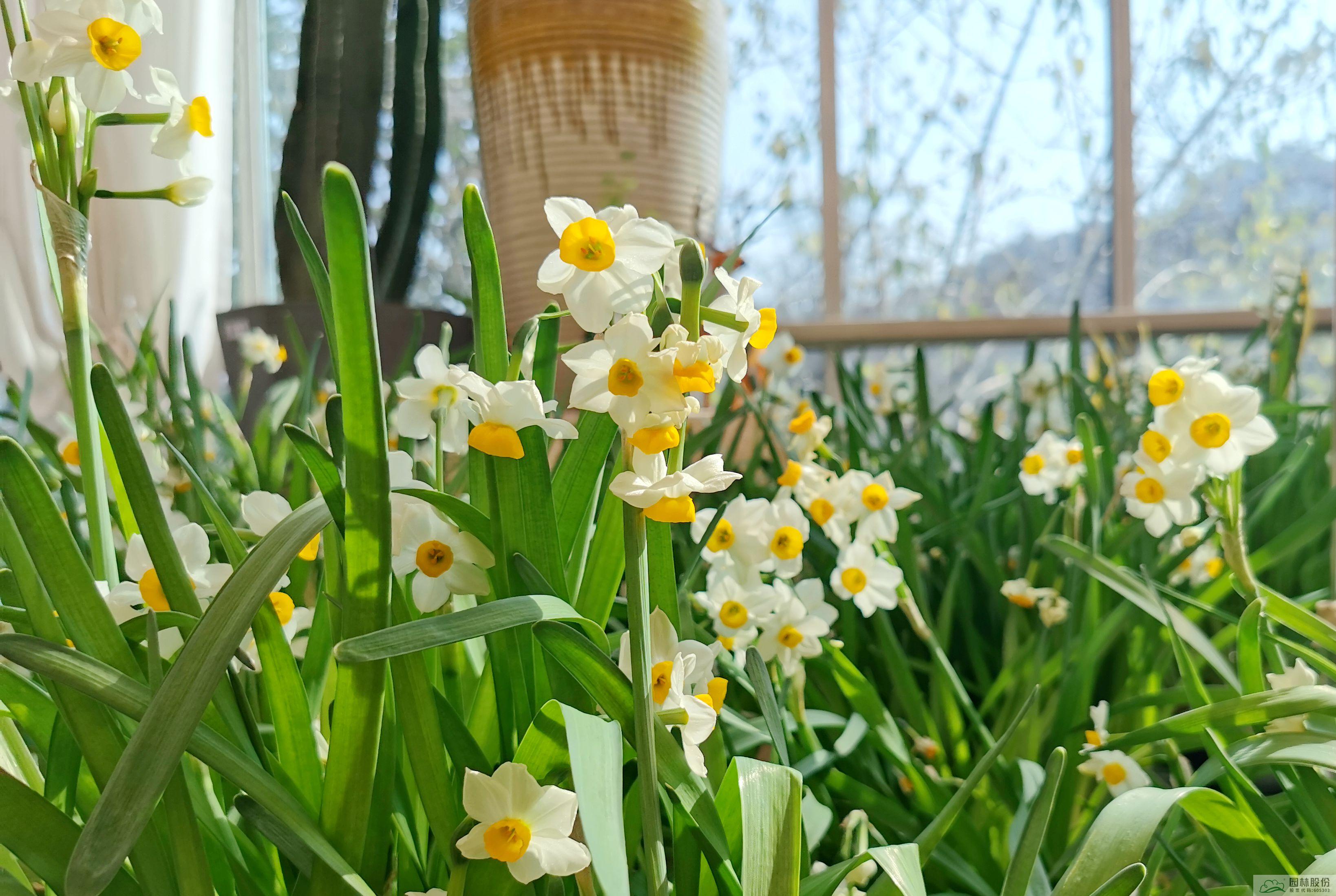 碧葉翠綠,綠的發光,花兒如白玉一般,清香高雅的水仙